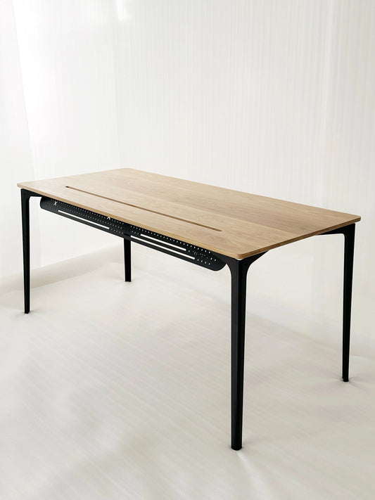 LUX DESK // SOLID OAK // A lighter, simpler workstation. Meticulous full grain oak with a skinny slot. 4mm steel legs (4 colours), multi plug holder & hook.