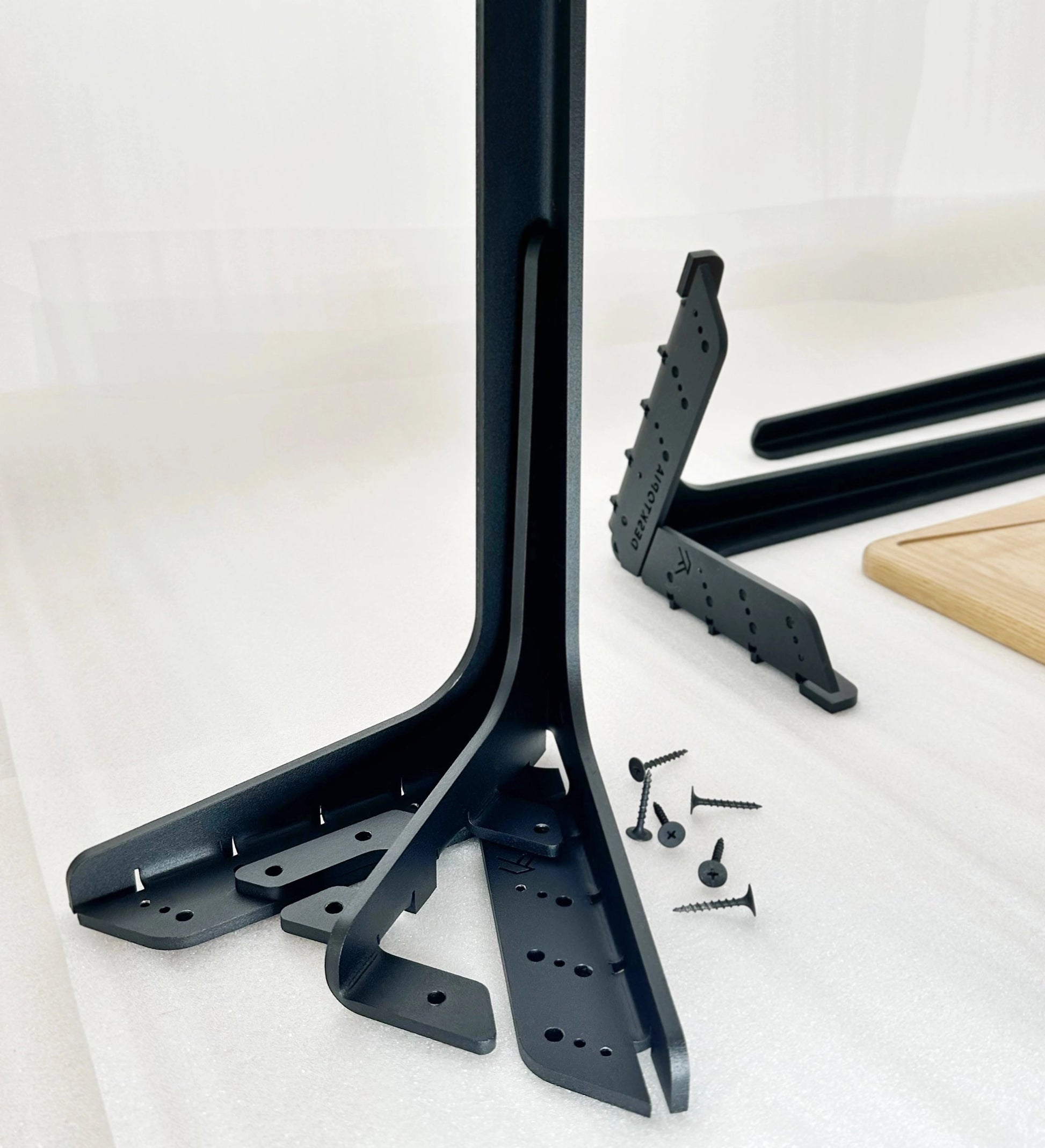 Designed, curved, and powder-coated to fit just about any countertop. Structurally connect to the underside with as little engineering as possible. Super slender, (BUT THICK) super simple, laser-cut, COLD-ROLLED 6mm carbon steel that has been air-bent to the perfect curve (twice). No welding, joins, or screws that will rattle loose as you pound that keyboard, chop that carrot, or put your feet up. Coated in a color that suits you and is durable (class super | marine grade | lifetime guarantee | indoor-outdoor).